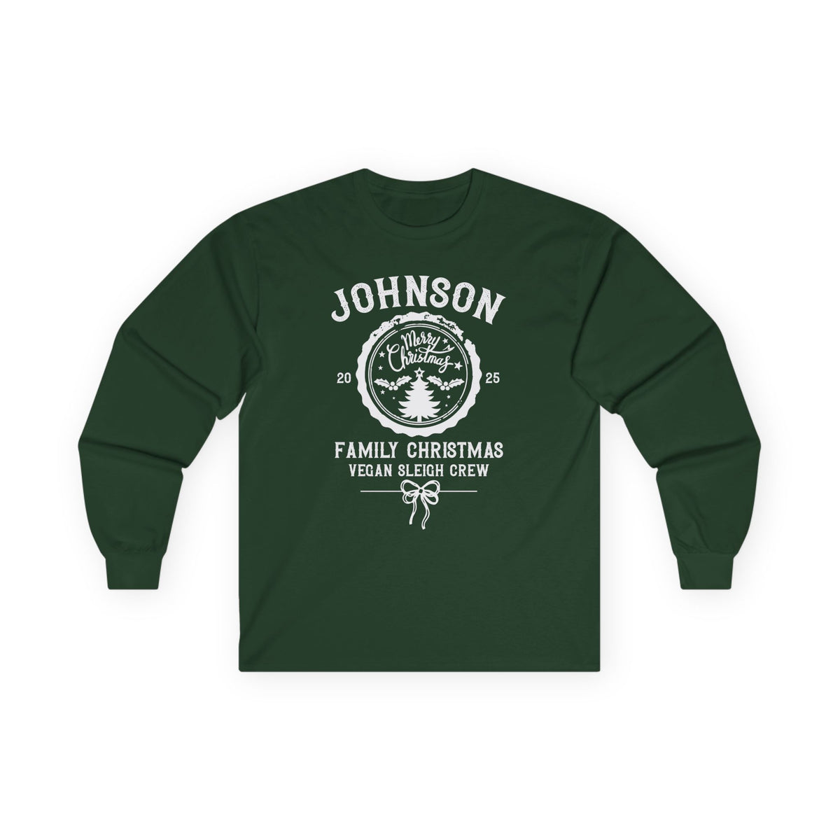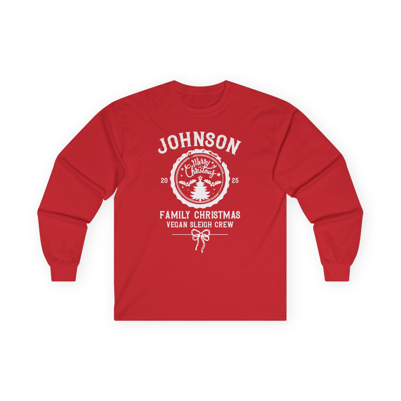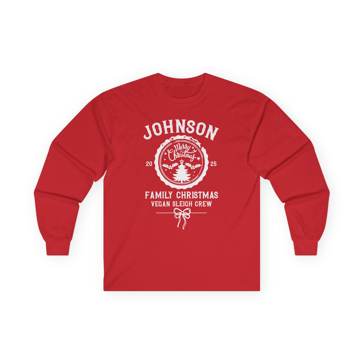 A warm, vintage-inspired long sleeve tee made for family-first holiday moments. The red or forest-green cotton has a thicker, lived-in feel and a distressed white crest that reads like a hand-stamped family ornament: name arching above, “Family Christmas” and playful details like “Vegan Sleigh Crew” below. Wear it while stringing lights, sipping cocoa by the tree, or corralling everyone for a goofy holiday photo. The ribbed collar and shoulder tape keep the shape even after many washes and hugs. It has a classic, roomy cut that pairs with cozy jeans or pajama bottoms for relaxed seasonal gatherings.